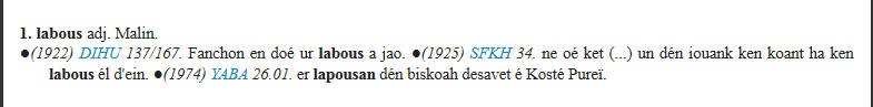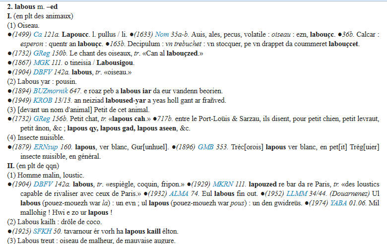 - Un dictionnaire diachronique du breton, depuis la période du moyen-breton jusqu'au breton contemporain, de 60.000 entrées environ.